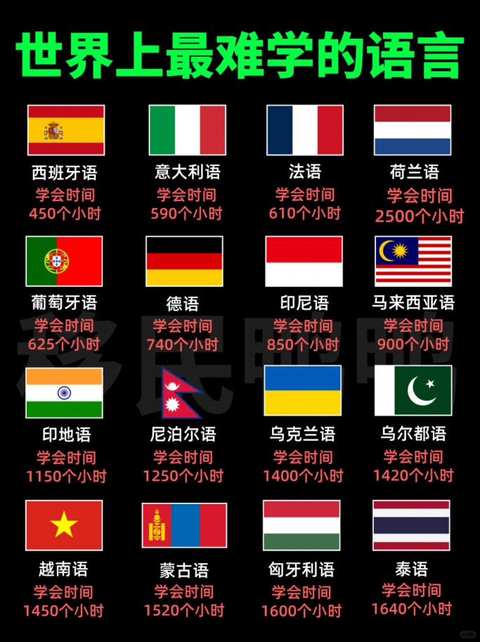 根据学习时长统计,汉语以2500小时登顶榜首,阿拉伯语、日语、韩语紧随其后。而西班牙语、意大利语等相对“友好”,只需几百小时就能掌握!