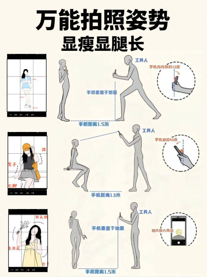 手机角度: 拍摄者蹲下或将手机放低,向上倾斜约45度拍摄,这样能拉长腿部线条。手机距离被拍摄者大约1.5米。