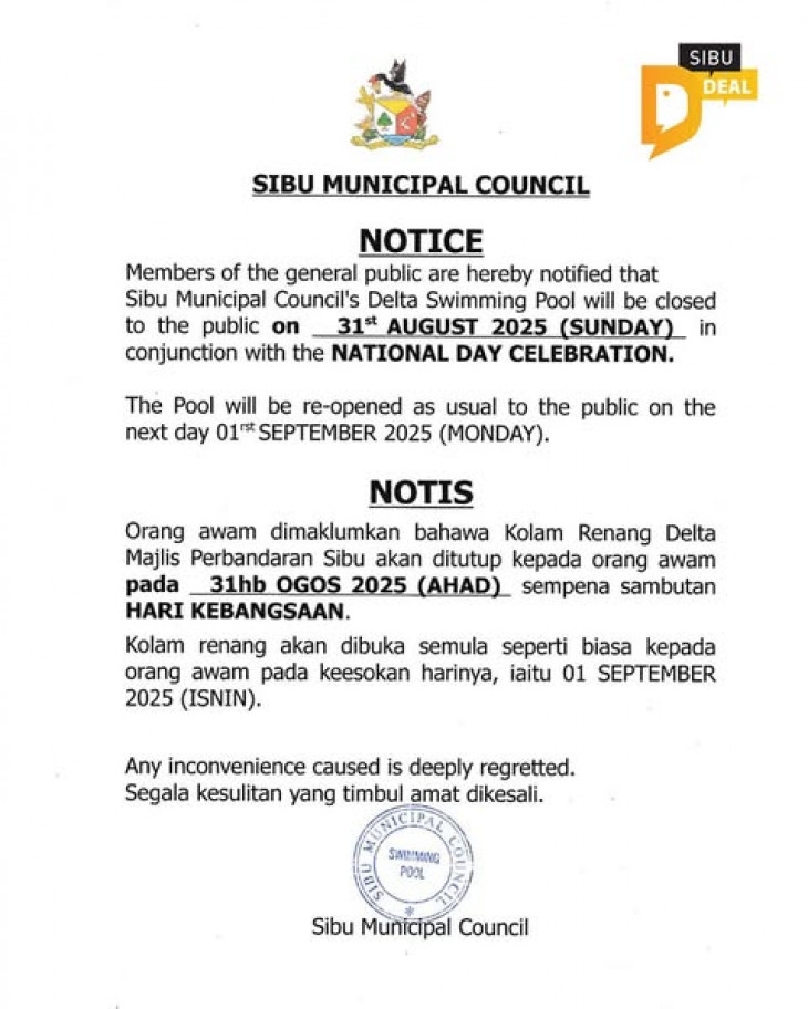 为了配合国庆日公共假期,诗巫市议会属下德大泳池将于 #8月31日(星期日)#暂停开放。