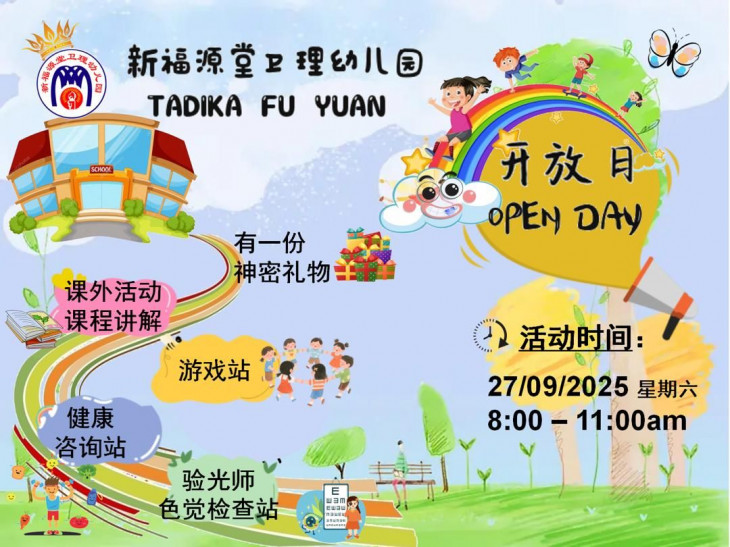 新福源堂卫理幼儿园将于 2025年9月27日(星期六)举办一场精彩的开放日(OPEN DAY)活动,所有家长和小朋友可以前去参观体验噢。