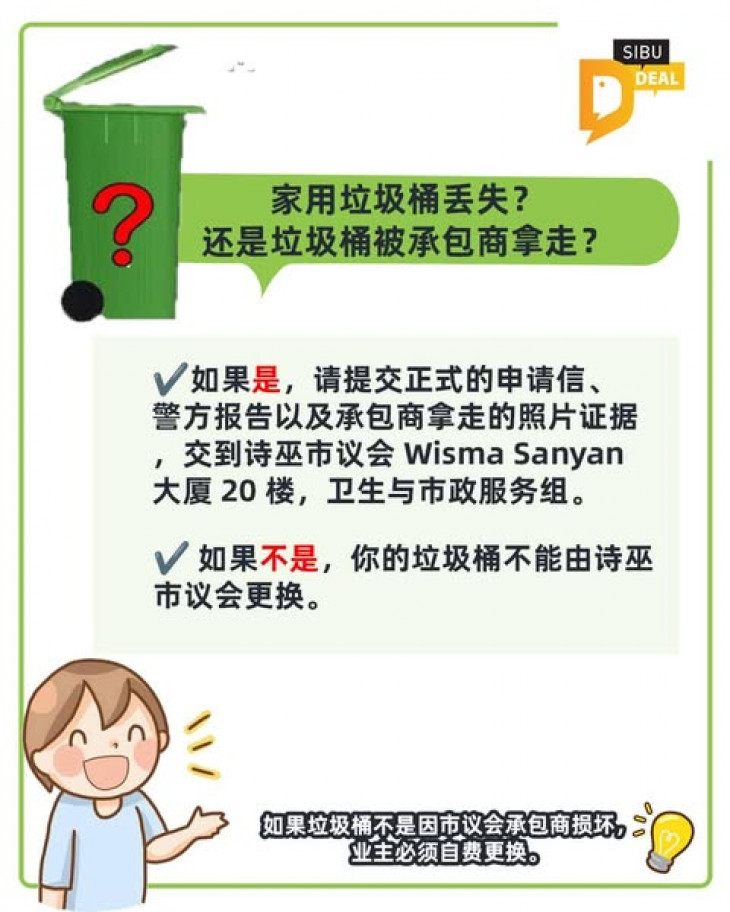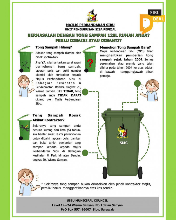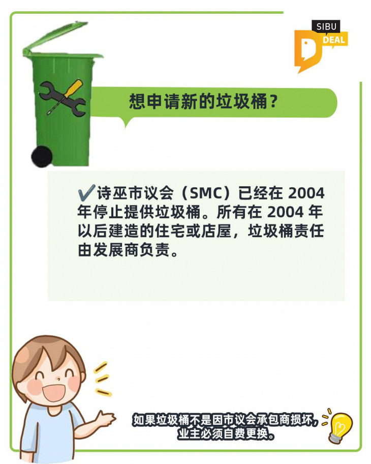 🗑️ 想申请新的垃圾桶?诗巫市议会(SMC)已经在 2004 年停止提供垃圾桶。所有在 2004 年以后建造的住宅或店屋,垃圾桶责任由 #发展商 负责。