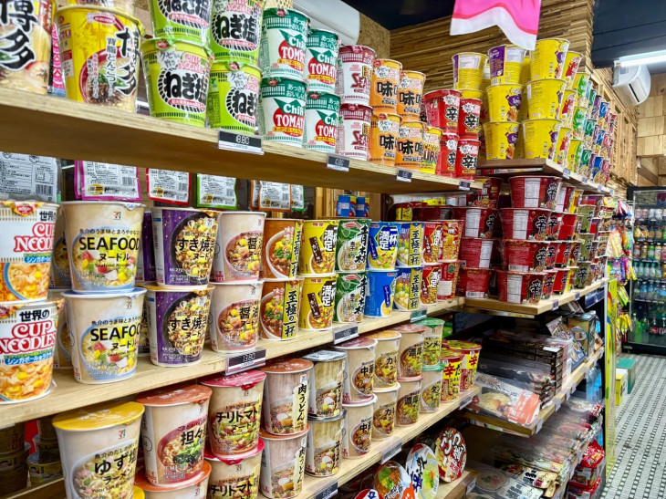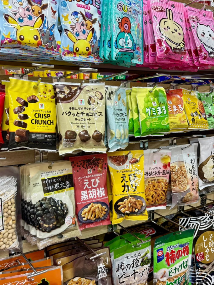 🍫 架子上一排排都是日本进口的零食、泡面