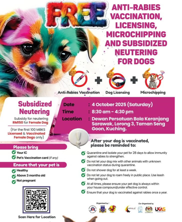 古晋南市议会(MBKS)联合砂拉越兽医服务局(DVSS),将于 本周六(10月4日) 举办免费狗只狂犬病疫苗接种及相关服务: