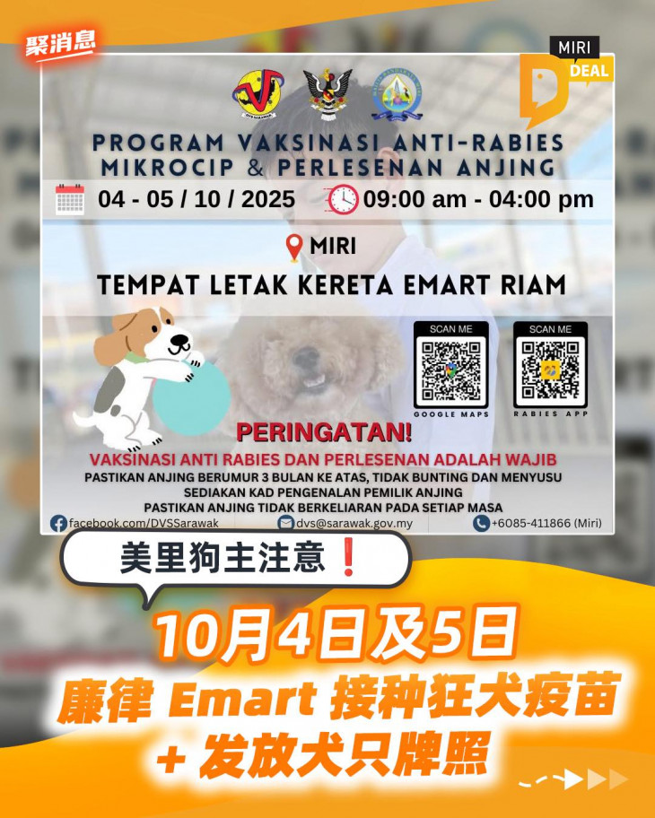 🐶美里养狗的主人注意啦!为了守护爱犬与公众的安全,美里市政局将配合 #砂拉越兽医局(美里分局)及 #美里省卫生局 于即将来临的周末— 2025年10月4日(星期六)至5日(星期日),在廉律Emart停车场展开大规模 狂犬疫苗接种、芯片植入与犬只牌照发放计划💉