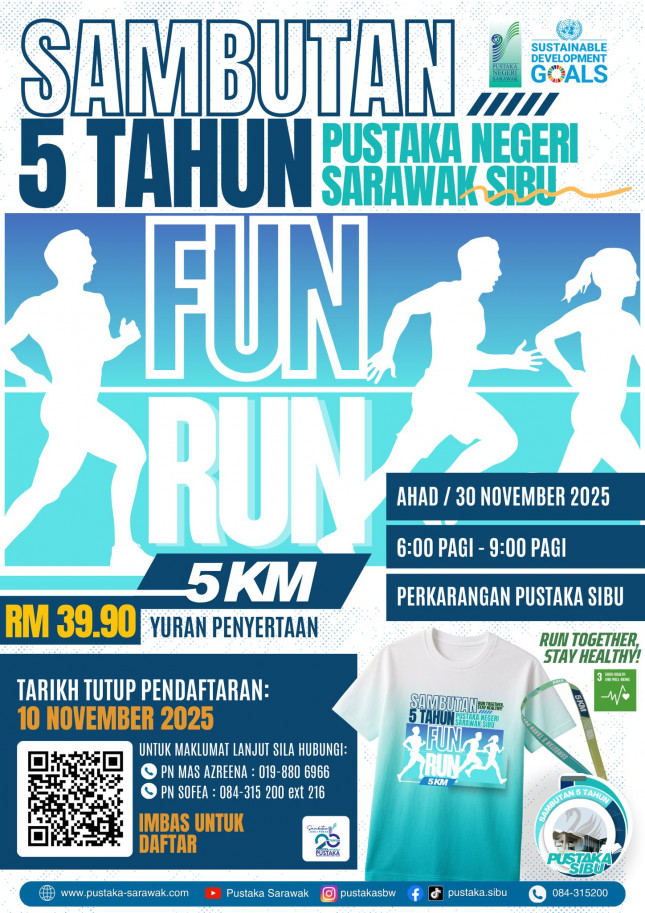 Sempena Sambutan 5 Tahun Pustaka Negeri Sarawak Sibu, kami menjemput anda semua untuk turut serta dalam Fun Run 5KM yang akan diadakan pada;