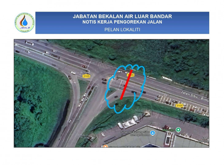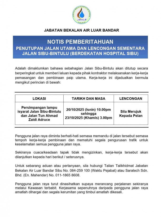 砂拉越农村水供局(JBALB)发布通知:为了进行主要水管的安装与建设工程,诗巫-民都鲁路(Jalan Sibu-Bintulu)部分路段将实施分阶段关闭和临时改道。