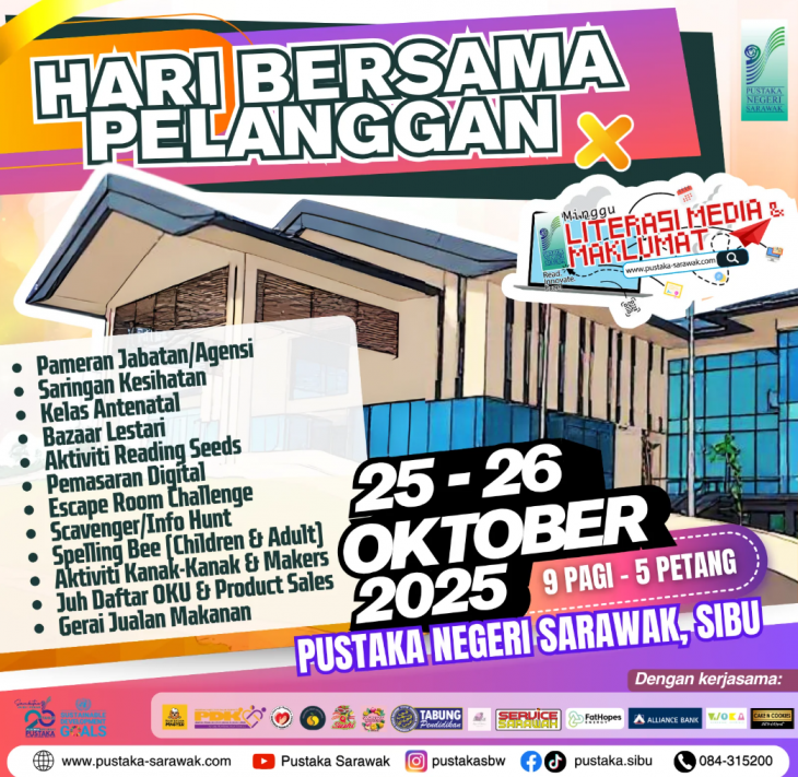 Come join us at Sarawak State Library (Pustaka Sibu) for our Customer Day Programme β happening on Oct 25β26 (FriβSat), from 9 AM to 5 PM at Jalan Tun Tuanku Bujang, Sungai Merah.