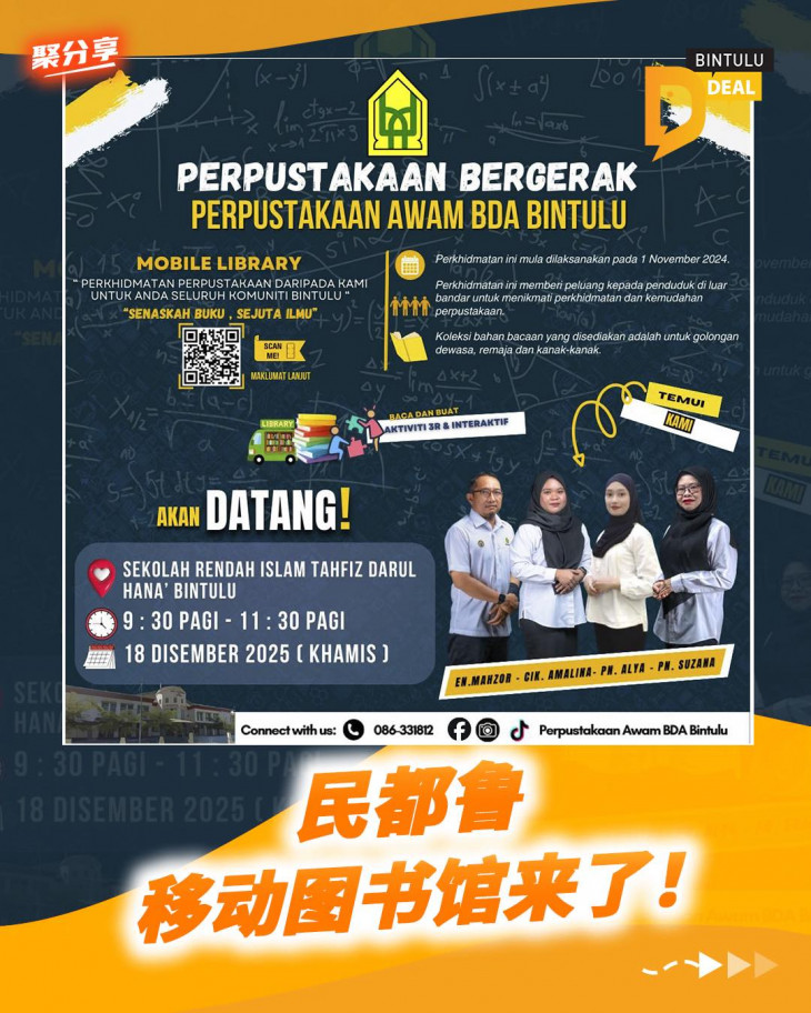 📱 社交媒体:Facebook / Instagram / TikTok:Perpustakaan Awam BDA Bintulu