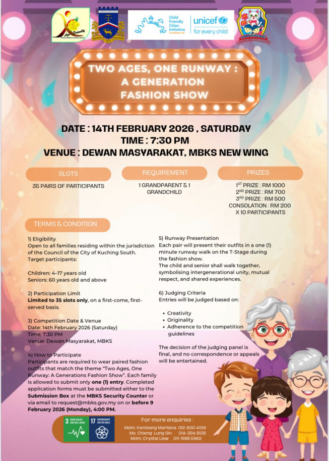 Kuching South City Council(MBKS)推出 “Two Ages, One Runway: A Generation Fashion Show”,通过让祖孙同台走秀,促进代际交流,打造更包容、以家庭为核心的社区。