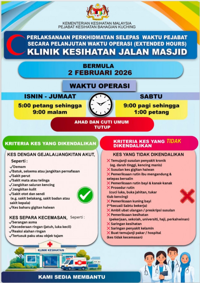 好消息!为了方便上班族和白天无法前往诊所的市民,古晋市区清真寺路(Jalan Masjid)政府诊所从今日起推出延长服务时段,提供非办公时间的基本医疗服务,协助处理轻症至半紧急个案,同时缓解白天门诊的拥挤。