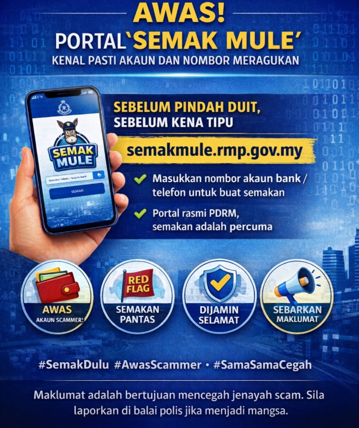 警方推出的 「Semak Mule」核查平台,正是防诈的重要工具。许多诈骗案件,都是因为民众轻信来历不明的高回酬投资、紧急来电或可疑转账指示,在未核实的情况下贸然转账,最终造成无法挽回的损失。