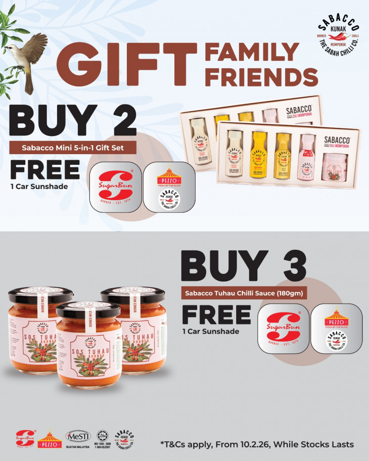 Buy 2 Sabacco 5-in-1 Gift Sets or 3 bottles of Tuhau Chili Sauce, and get 1 FREE SugarBun Sunshade!