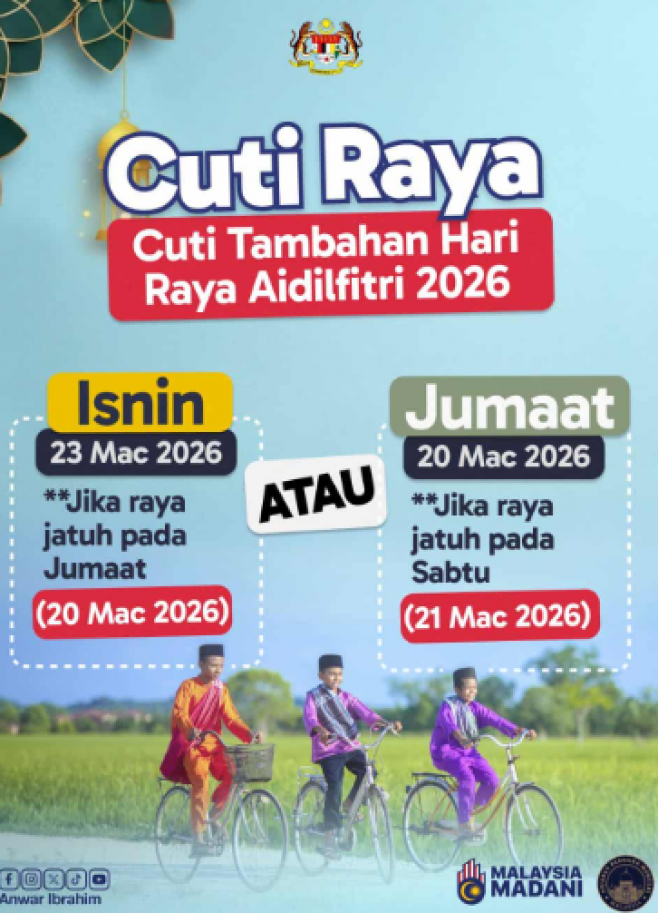 配合即将到来的开斋节,马来西亚政府宣布 额外公共假期安排。根据 马来西亚人力资源部(KESUMA) 最新声明,政府将依据情况提供额外假期,让民众有更多时间与家人共度佳节 🌙