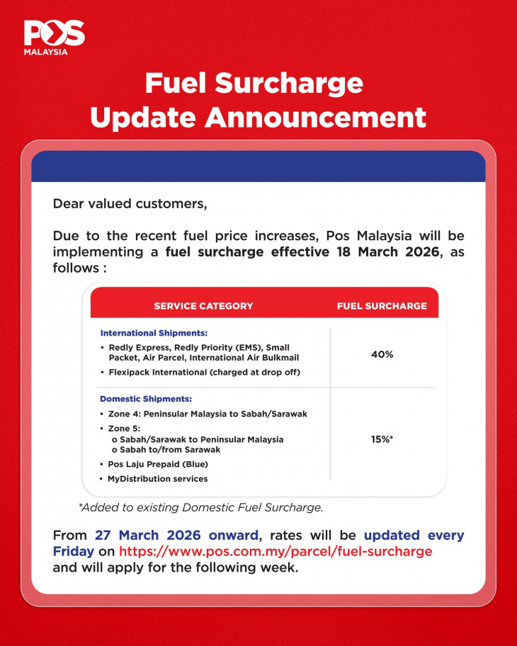 随着中东局势紧张,国际油价持续上升,运输成本也明显增加。为了应对这一情况,大马邮政日前在官方 Facebook 发布声明:即日起 国内及国际邮寄服务将加收燃油附加费。