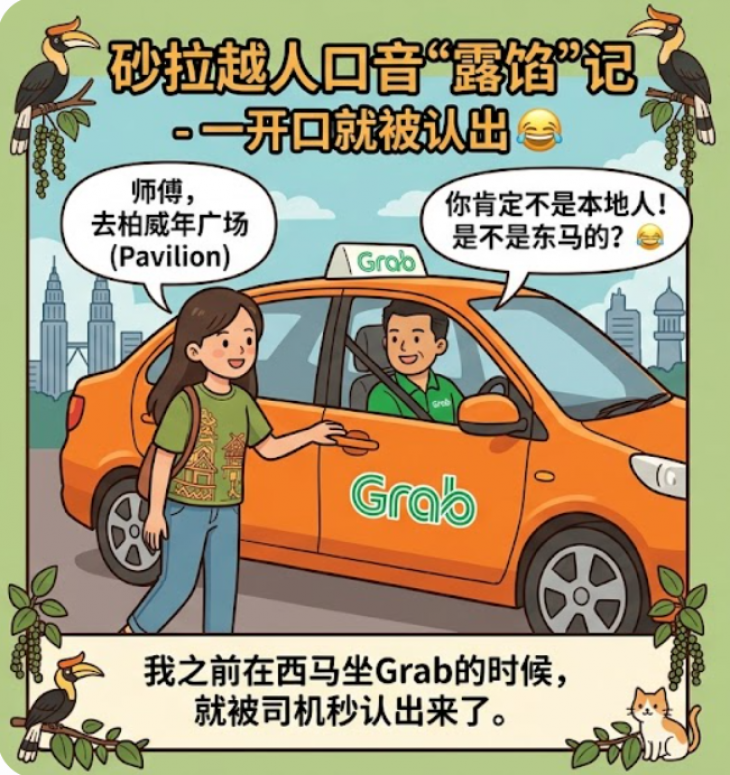 我之前在西马坐Grab的时候,就被司机秒认出来了。一开口聊天,他笑着说:“你肯定不是本地人!是不是东马的?”😂