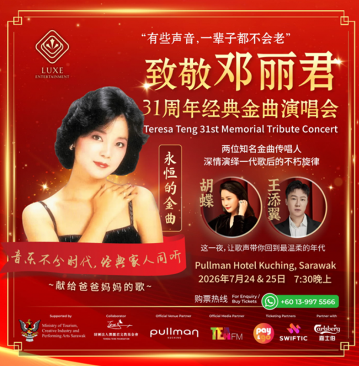 备受期待的 邓丽君31周年纪念致敬演唱会 🎤 将于 7月24日至25日,在古晋 Pullman Kuching 隆重举行!