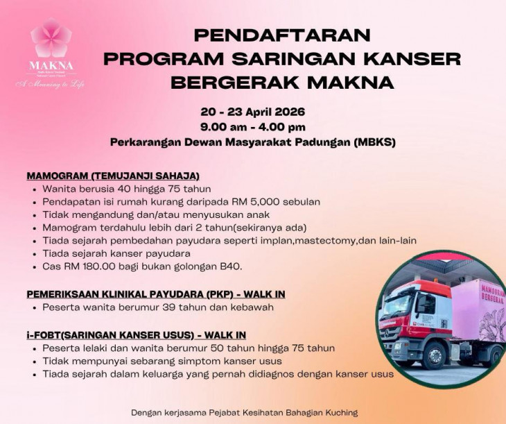 为了提升民众对健康的关注与癌症预防意识,古晋省卫生局联合 MAKNA 举办 “2026年流动癌症筛检与健康检查计划”,为公众提供多项 免费健康筛查服务,欢迎大家踊跃参与!