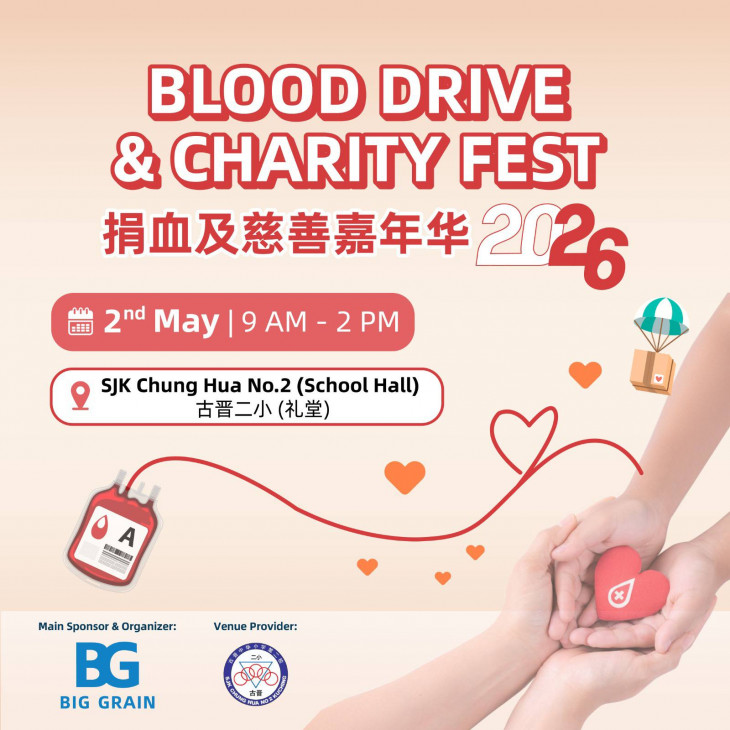 欢迎大家于 2026年5月2日,前往 古晋二小礼堂,参与 Blood Drive & Charity Fest(献血与慈善嘉年华) 🤝