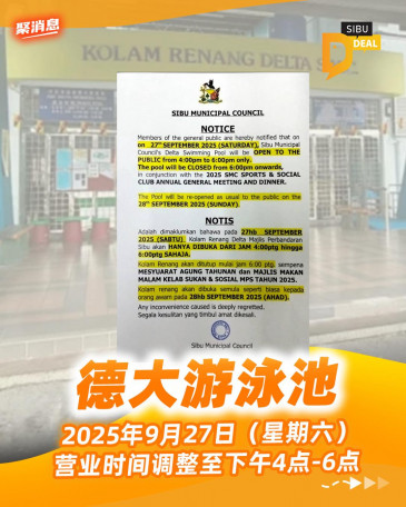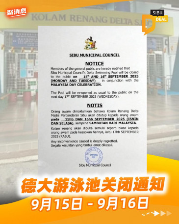 ▌sibuDEAL聚消息 ▌📢德大游泳池中秋节调整..